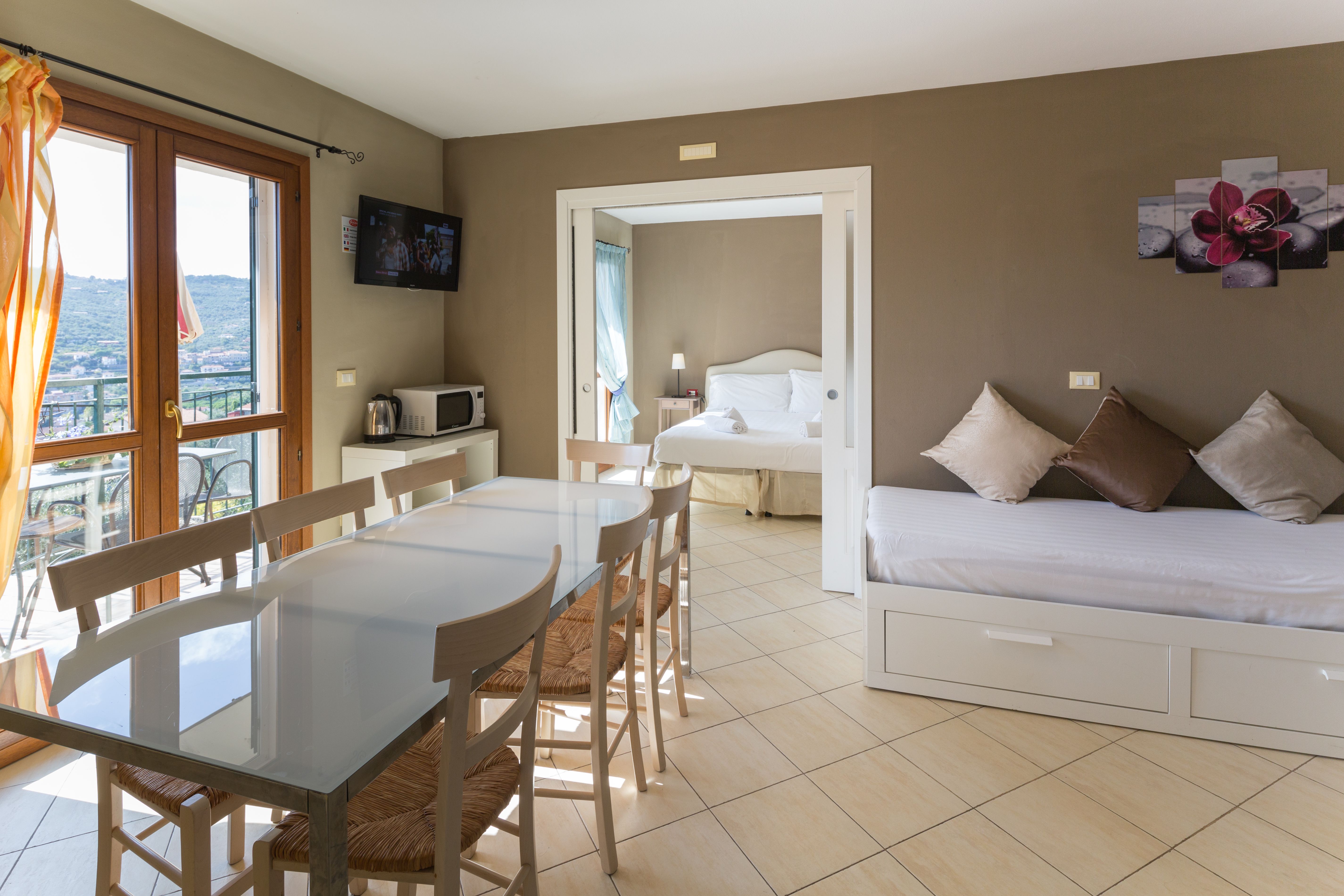 La Camera Familiare è perfetta per le famiglie numerose, con una capacità massima di 5 persone. Dispone di una camera da letto separata con letto matrimoniale o due letti singoli, una zona living attrezzata con divano letto matrimoniale e poltrona letto, e una sala da bagno con doccia. Non è presente l'angolo cottura.