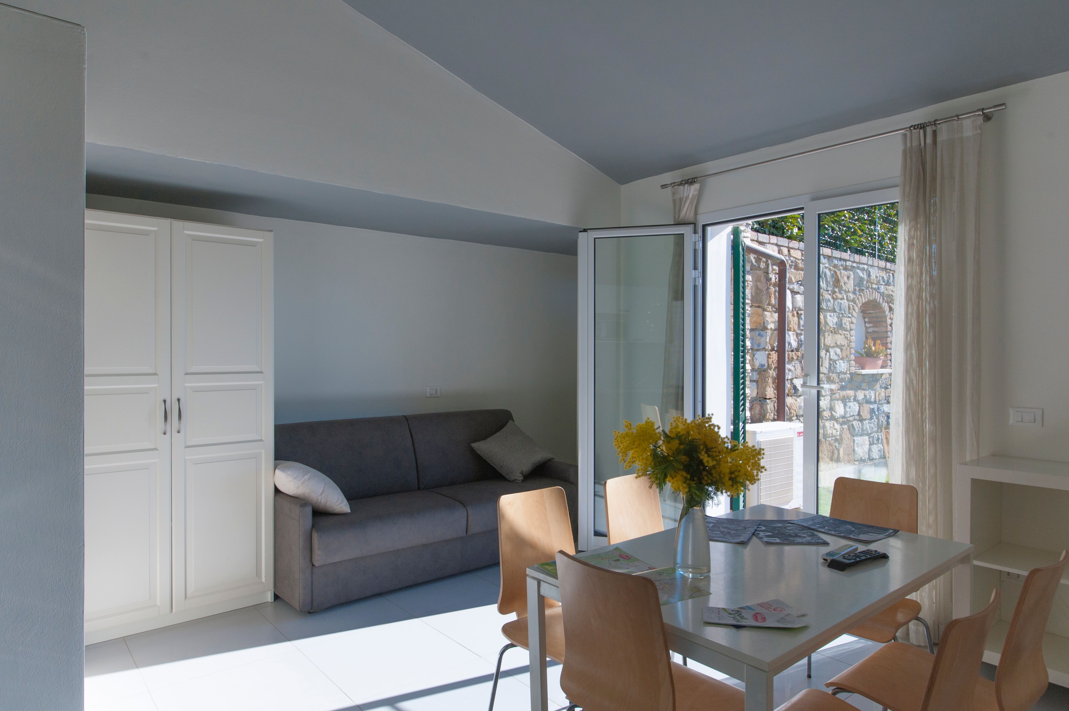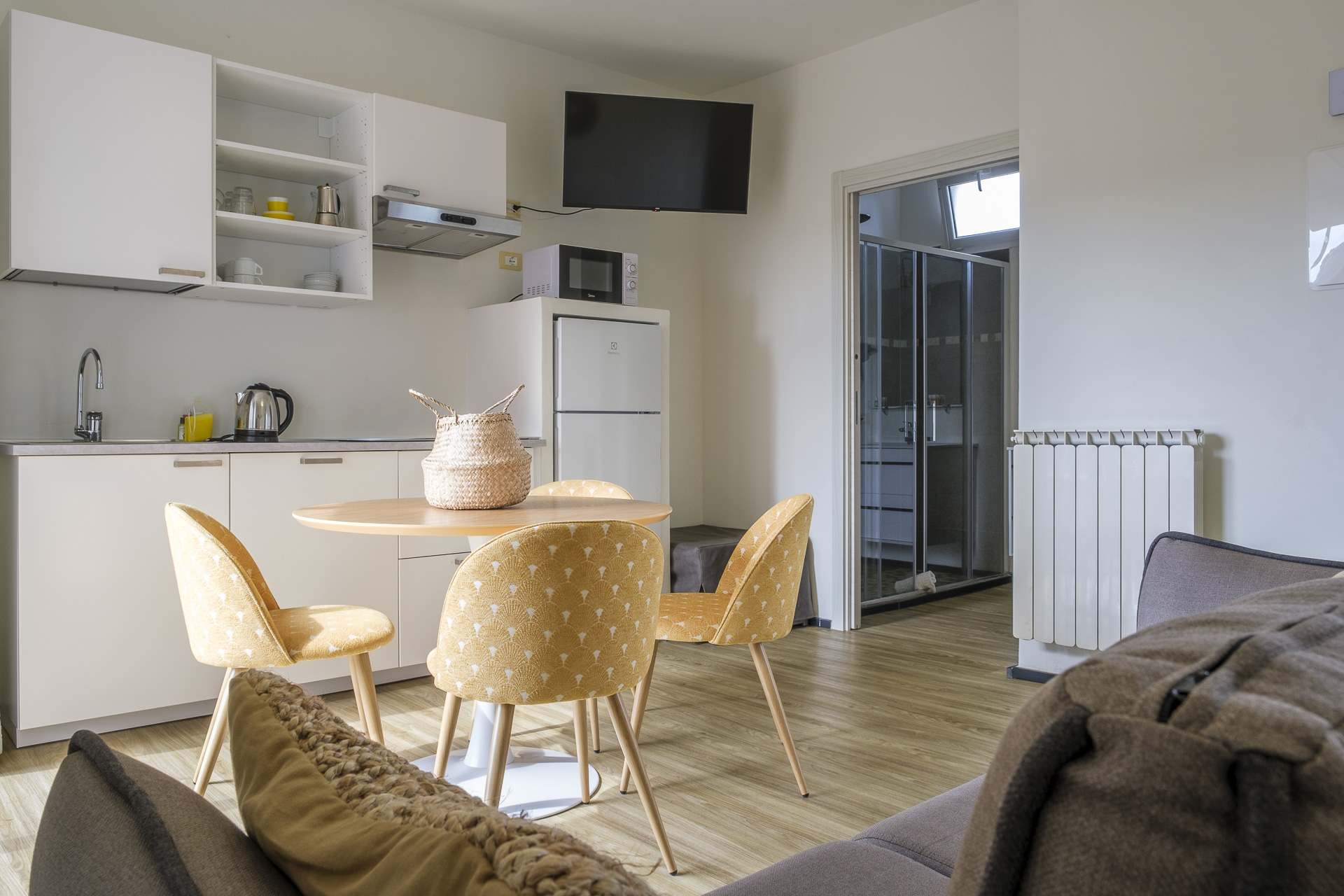 Ambiente unico funzionale e accogliente, suddiviso in zona giorno con tavolo, sedie e divano letto matrimoniale, e zona notte con letto matrimoniale o due letti singoli, comodini e armadio. La sala da bagno è completa e dotata di una grande doccia per garantire comfort e praticità. Perfetta per soggiorni all’insegna del relax, offre spazi ben organizzati e versatili, ideali per coppie o piccoli gruppi.